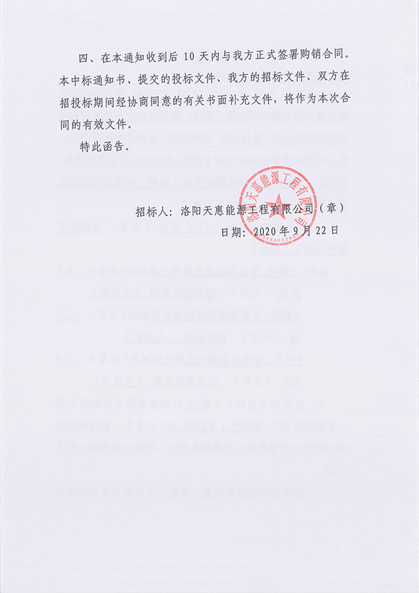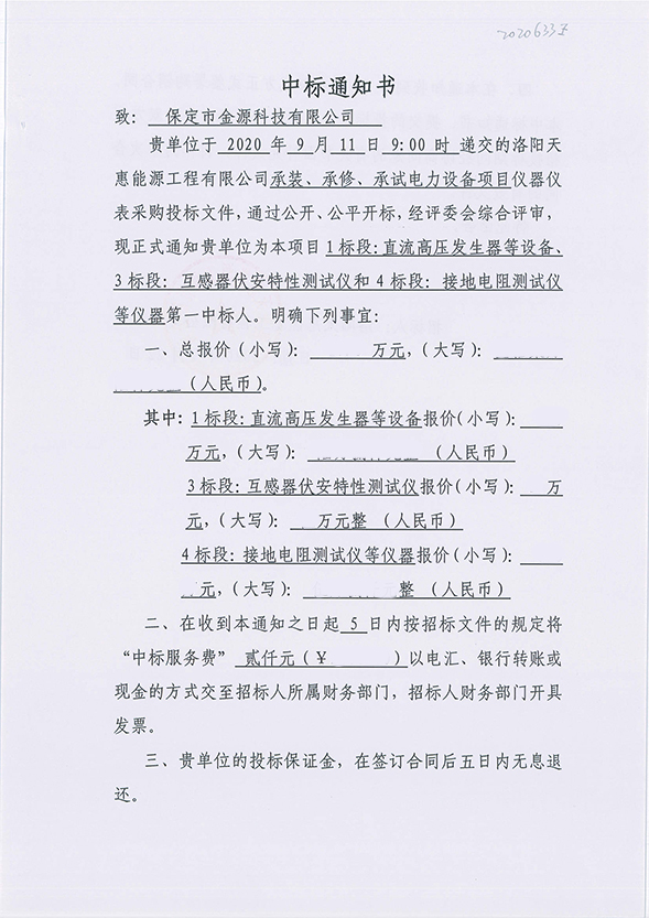 金源公司在洛陽天惠能源工程有限公司承裝、承修、承試電力設備項目儀器儀表采購項目中成功中标