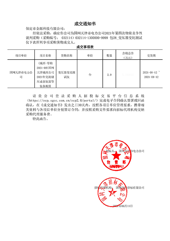 金源公司在國網天津市電力公司2021年第四次物資競争性談判采購項目中成功中标