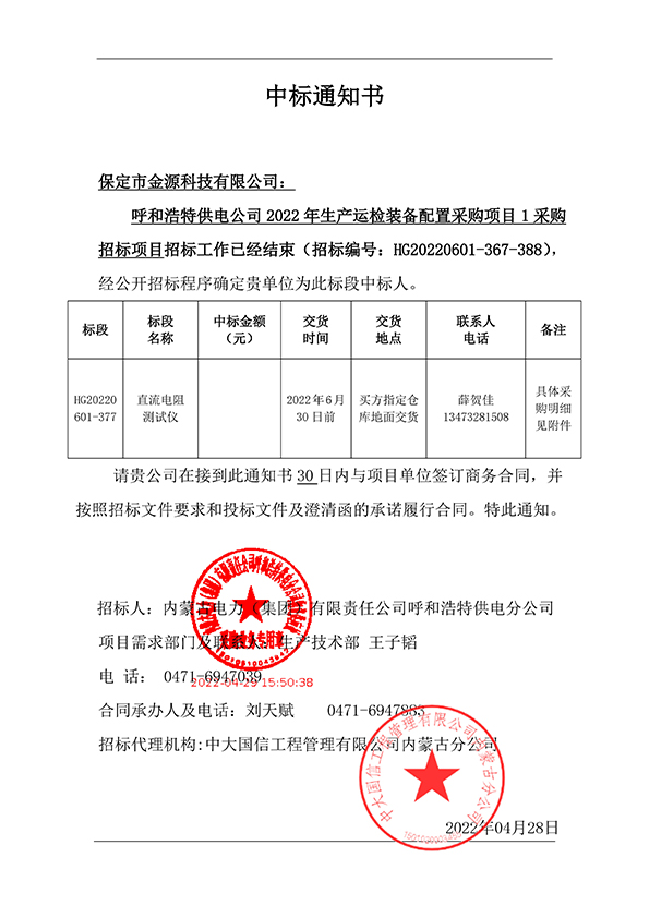 金源公司在呼和浩特供電公司2022年生産運檢裝備配置采購項目1中成功中标