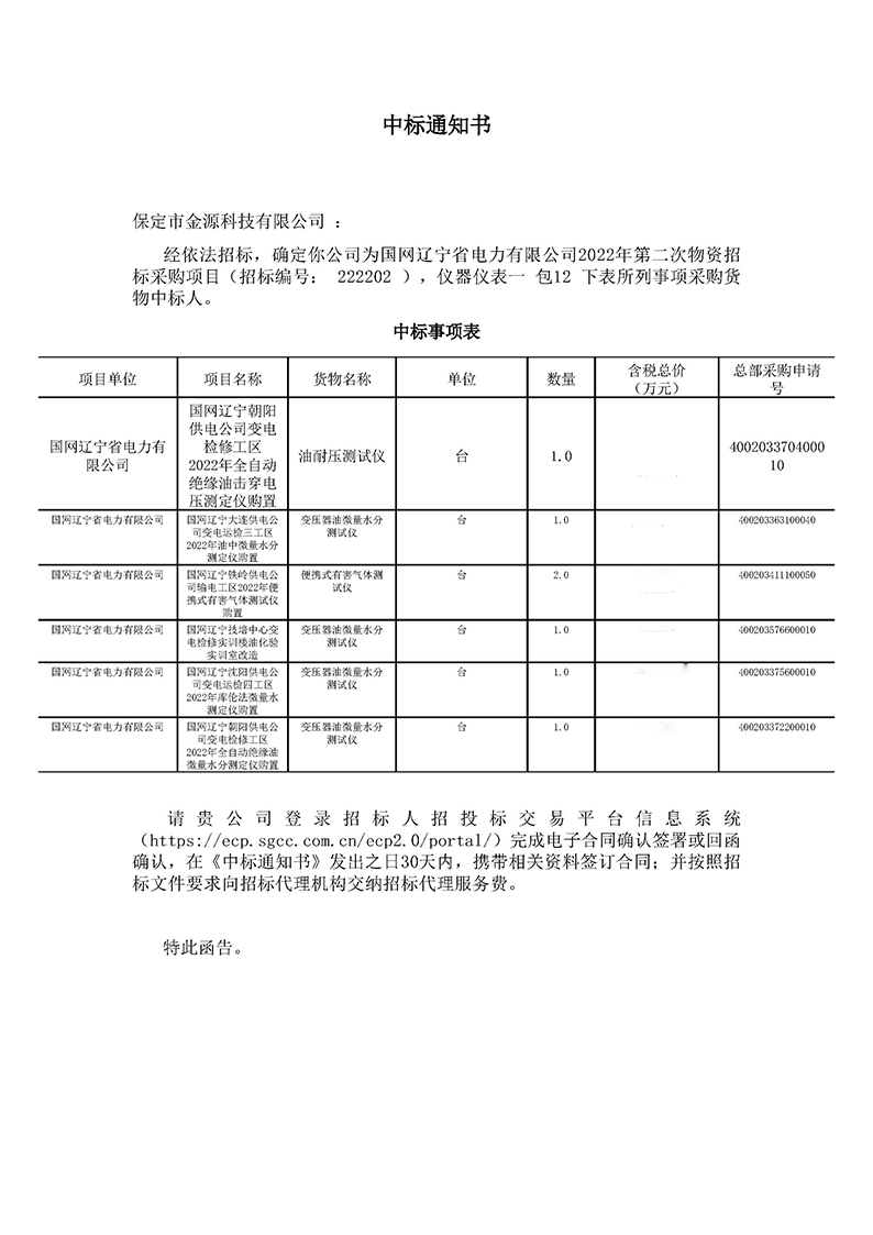 金源公司在國網遼甯省電力有限公司2022年第二次物資招标采購項目中成功中标