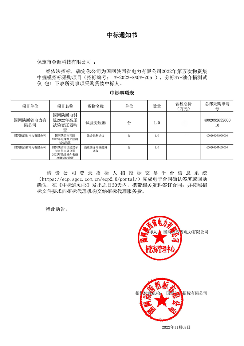 金源公司在國網陝西省電力有限公司2022年第五次物資集中規模招标采購項目中成功中标